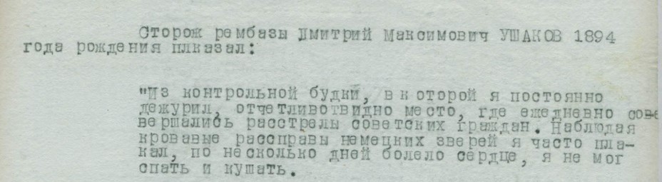 Сторожу ремонтної бази Дмитру Ушакову вдалося побачити "душегубку" в січні 1942 року. Свідок зазначав, що, коли спеціально обладнана машина з дверима в задній частині кузова зупинилася, німці не поспішаючи почали її оглядати.