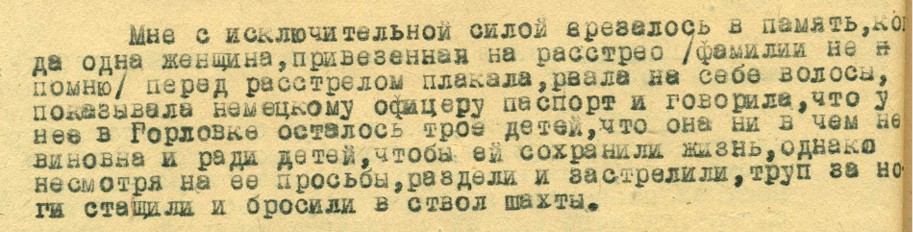 "Навесні, у травні 1943 року до шахти під'їхав легковий автомобіль, з якого вийшли два німецьких офіцери. Один з них тягнув до жерла шахти дівчинку років 10-12. Дівчинка впиралася щосили і кричала: «Ой, дядечко, не стріляйте!». Ці крики лунали довго, потім я почув постріл, і дівчинка замовкла. Після цього, той же офіцер витягнув з машини дитину 2-3 років, підніс його до жерла шахти і застрелив. Повернувшись втретє, офіцер виніс з німецького автомобіля зовсім маленьку дитину, яку також застрелив", - розповів свідок на допиті.