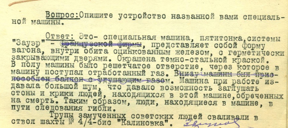 Один із заарештованих - Іван Звігунов, який працював у Гестапо на посаді радиста-електрика, розповідав, що спеціальною «душегубкою» керував тільки німецький водій Вайсбегер. Іншим машина для масового знищення радянських громадян не довірялася.