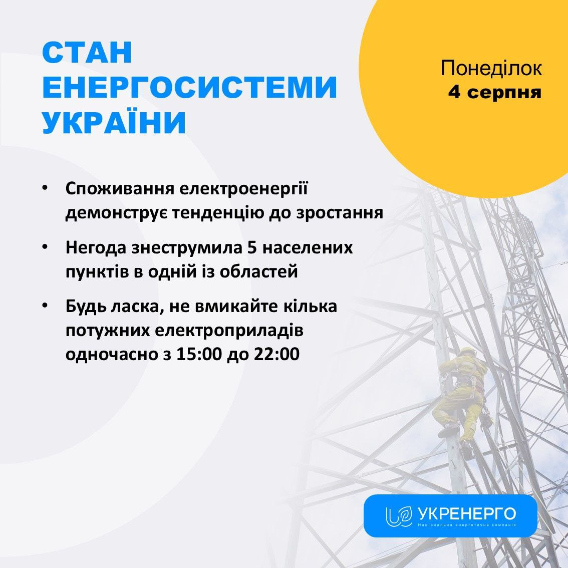 Згідно з даними, споживання електроенергії демонструє тенденцію до зростання. Так, у понеділок, 4 серпня, станом на 09:30, воно було на 3,7% вищим, ніж попереднього робочого дня, 1 серпня. Причиною є підвищення температури у більшості регіонів і традиційне зростання рівня енергоспоживання на початку робочого тижня.