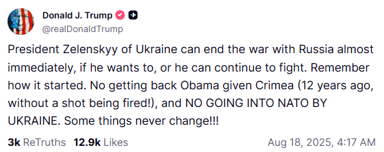 "Жодного повернення Обами, який віддав Крим (12 років тому, без жодного пострілу)", — наголосив очільник Білого дому.