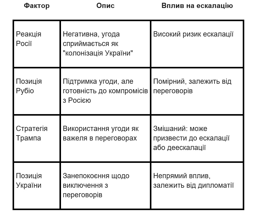 Хоча адміністрація Трампа позиціонує угоду як інструмент для зміцнення позицій у переговорах з Росією. Москва сприймає угоду як провокацію, що посилює економічну та політичну залежність України від США. Це буде спонукати Москву до дій, які загострять конфлікт:
